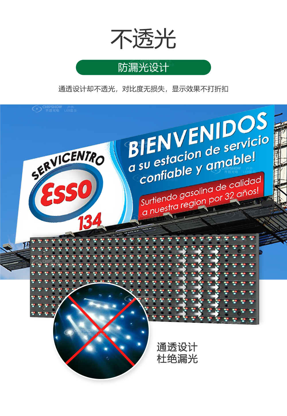 透:模组透风不透光设计,通透率为7%,风可以在屏体间流转,有效降低风阻。