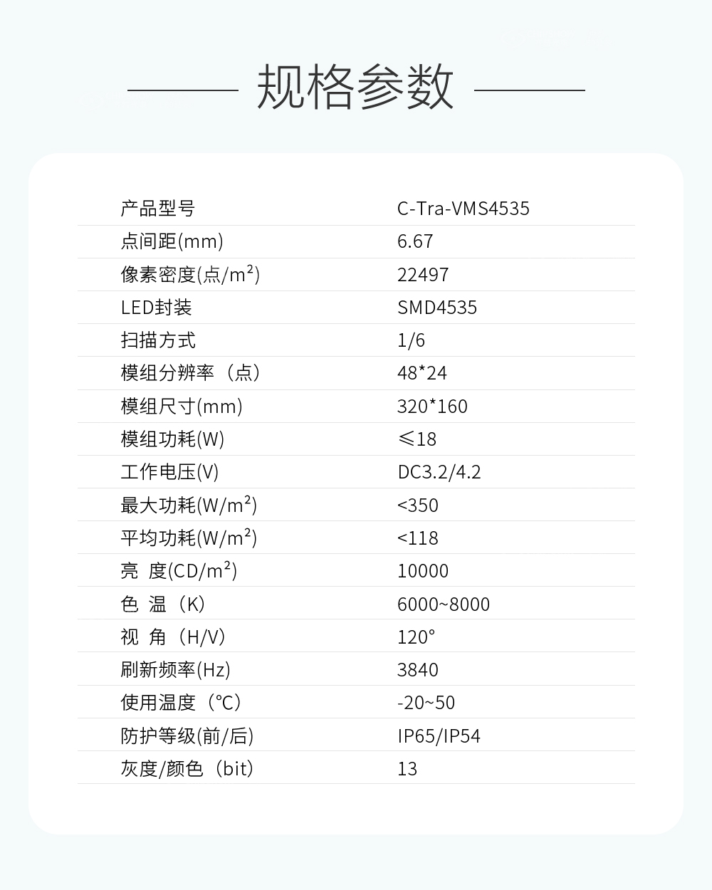 u  高亮节能:3.2V/4.2V低压供电,4535高亮灯珠,亮度≥10000CD /㎡,节能≥30%;