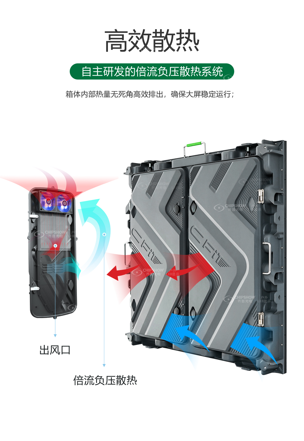 u  高效散热:自主研发的倍流负压散热系统,箱体内部热量无死角高效排出,确保大屏稳定运行;