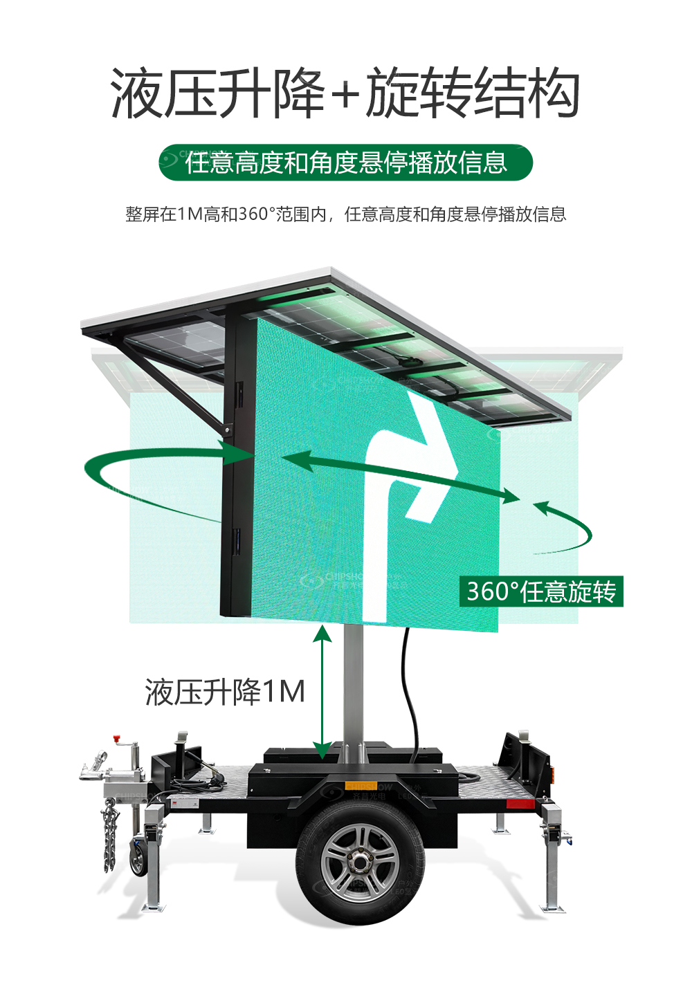 液压升降+旋转结构;整屏在1M高和360°范围内,任意高度和角度悬停播放信息。